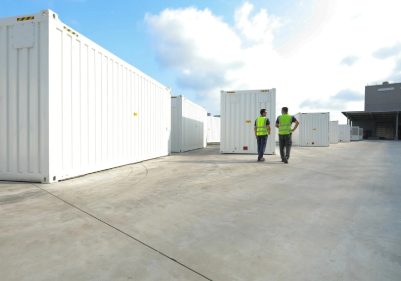工廠外,好幾十個潔白的20呎貨櫃櫛比鱗次。突地,一台將近三層樓高的跨運車,緩緩駛入儲能貨櫃區,跨架穩穩包覆住一個貨櫃;貨櫃落地的瞬間,發出低沉的碰撞聲,完全不用人力搬動,過程高效、安靜。每一次搬運,都像是一場精密編排的舞蹈,將重達數十噸的儲能設備穩穩送到位。